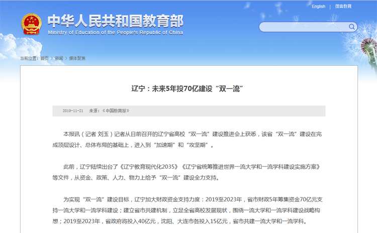 《方案》公布,辽宁将在5年内筹集70亿元资金,支持一流大学和一流学科建设。其中,我校等10所省属高校入选辽宁省国内一流大学建设高校,辽宁省5年内将投入建设资金35亿元。