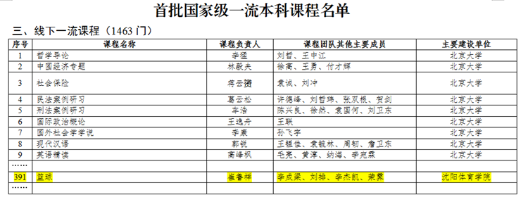 11月24日,教育部公布《教育部关于公布首批国家级一流本科课程认定结果的通知》,我校崔鲁祥教授主持申报的《篮球》课程位列其中,获评首批国家级一流本科线下课程,我校一流本科课程建设质量再上新台阶。