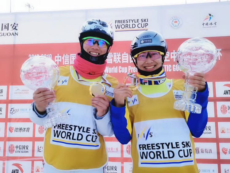 我校小将邵琪(左)获得国际雪联年度最佳新人奖
