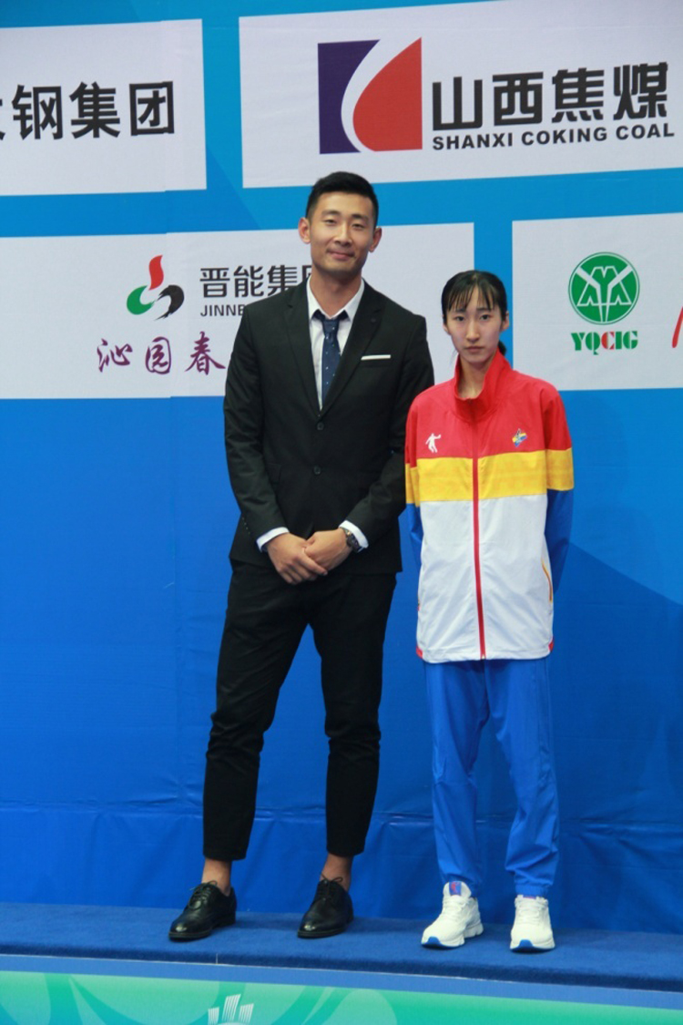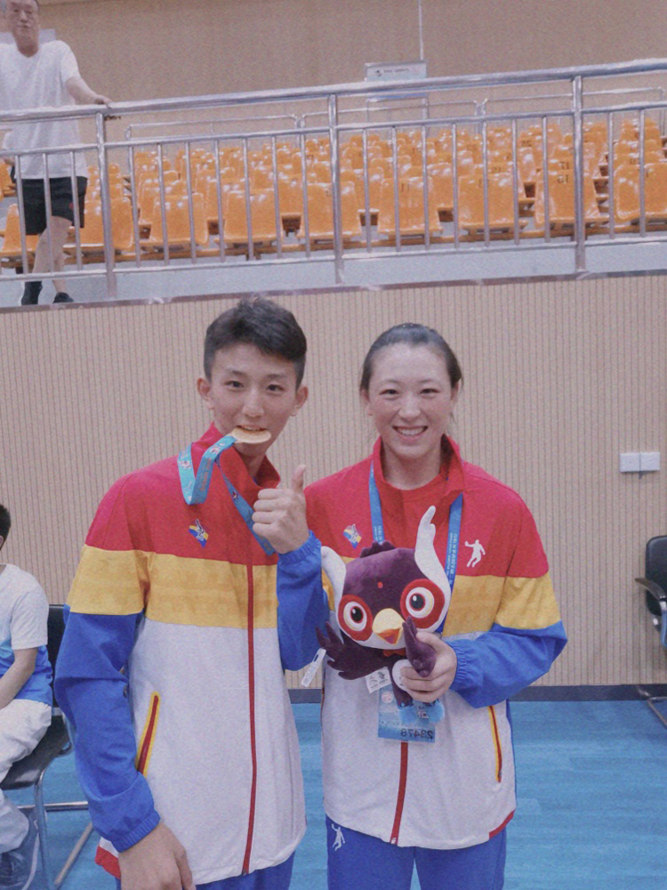 跆拳道运动员曹继一鸣与教练员杨艺合影