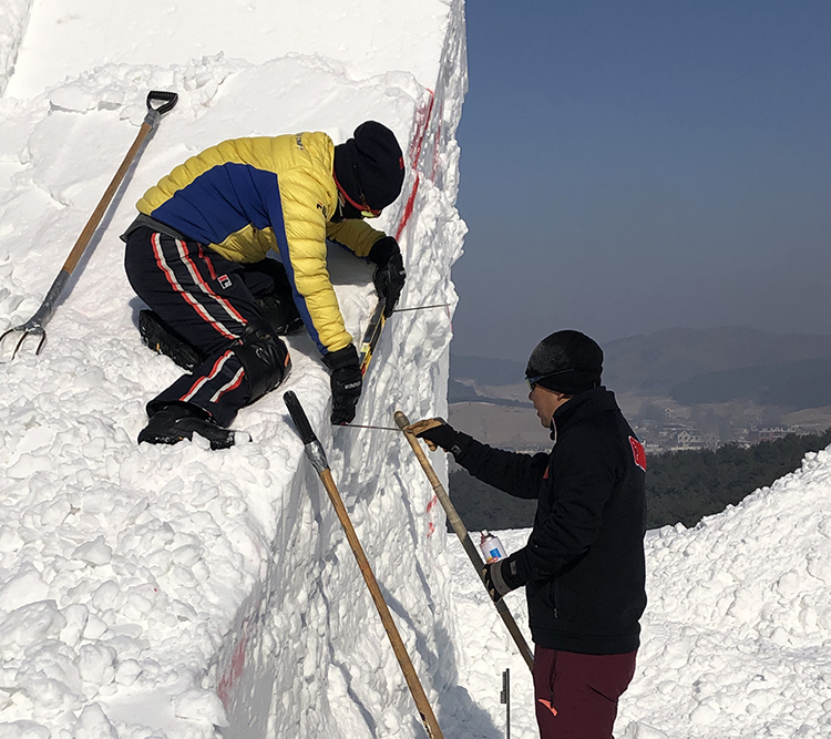 自由式滑雪空中技巧教练员正在修造跳台