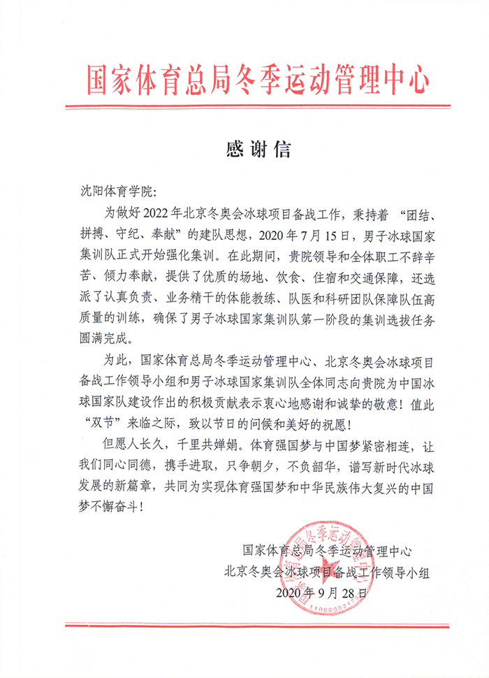 9月28日,国家体育总局冬季运动管理中心发来致谢信,向我校为中国冰球国家队建设作出的积极贡献表示诚挚谢意,表示愿与看球吧