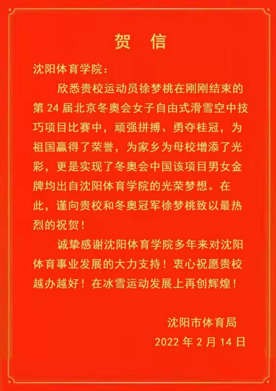 2月14日,我校运动员徐梦桃在北京冬奥会自由式滑雪女子空中技巧项目比赛中顽强拼搏、勇夺桂冠,为中国体育代表队收获一枚金牌。为此,沈阳市体育局向我校发来贺信。 新闻作者:党政办公室 责任编辑:全魁博 新闻日期:2022-02-15 点击:次
