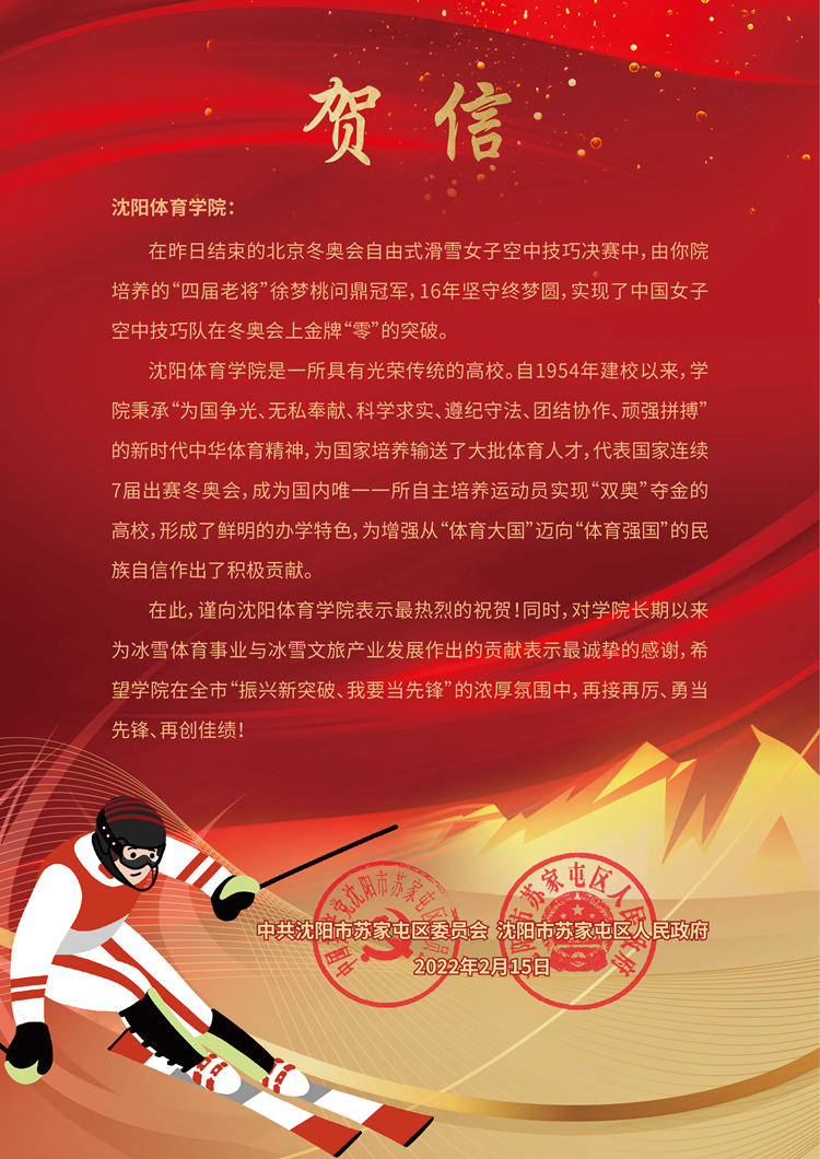2月14日,我校运动员徐梦桃在北京冬奥会自由式滑雪女子空中技巧决赛中问鼎冠军,实现了中国女子空中技巧队在冬奥会上金牌“零”的突破。为此,中共沈阳市苏家屯区委员会、沈阳市苏家屯区人民政府向我校发来贺信。 新闻作者:党政办公室 责任编辑:全魁博 新闻日期:2022-02-16 点击:次