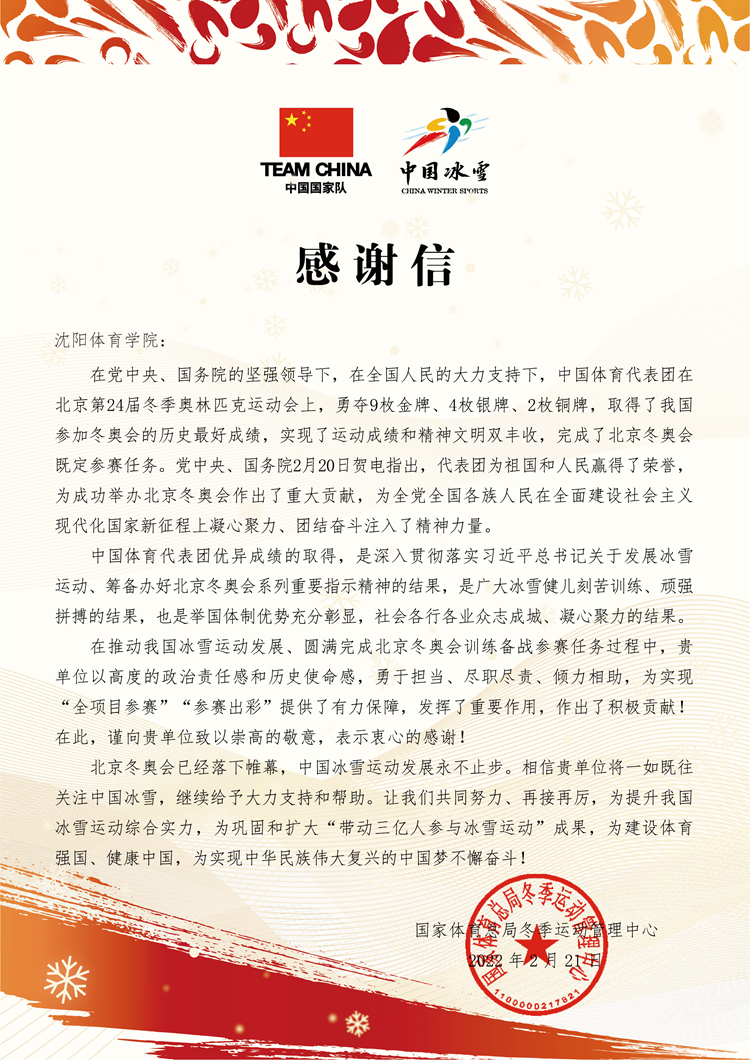 在2022年北京冬奥会上,中国体育代表团勇夺9枚金牌、4枚银牌、2枚铜牌,取得了我国参加冬奥会的最好成绩。在中国体育代表团收获的15枚奖牌中,包含了我校培养运动员获得的2金1银。同时,多年来我校以高度的政治责任感和历史使命感,勇于担当、尽职尽责,为实现中国体育代表团“全项目参赛”“参赛出彩”提供了有力保障,发挥了重要作用,作出了积极贡献。为此,国家体育总局冬季运动管理中心向我校发来感谢信。 新闻作者:党政办公室 责任编辑:全魁博 新闻日期:2022-02-22 点击:次