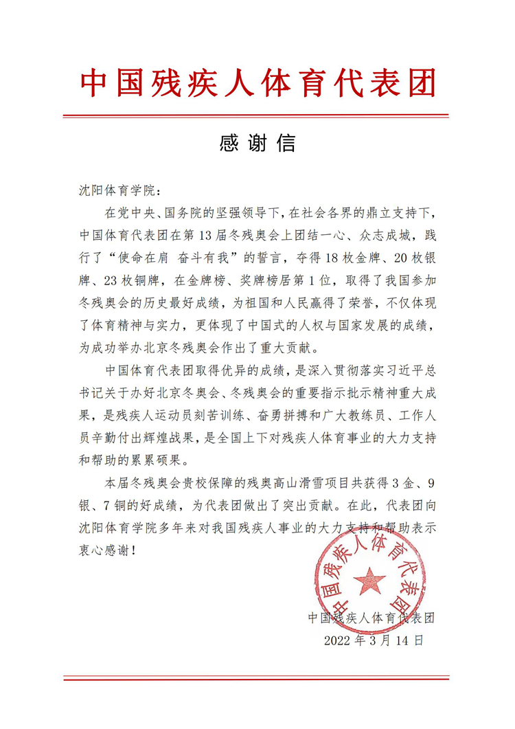 3月13日,2022年北京冬残奥会顺利闭幕,中国体育代表团在本届冬残奥会上团结一心,众志成城,以18枚金牌、20枚银牌、23枚铜牌的傲人成绩,位居金牌榜、奖牌榜第一位,取得了我国参加冬残奥会的历史最好成绩。 本届冬残奥会中,我校保障的残奥高山滑雪项目共获得3金、9银、7铜的优异成绩,为代表团做出了突出贡献。为此,中国残疾人体育代表团向我校发来感谢信,同时对我校多年来为我国残疾人事业的大力支持和帮助表示衷心感谢。 新闻作者: 责任编辑:全魁博 新闻日期:2022-03-17 点击:次