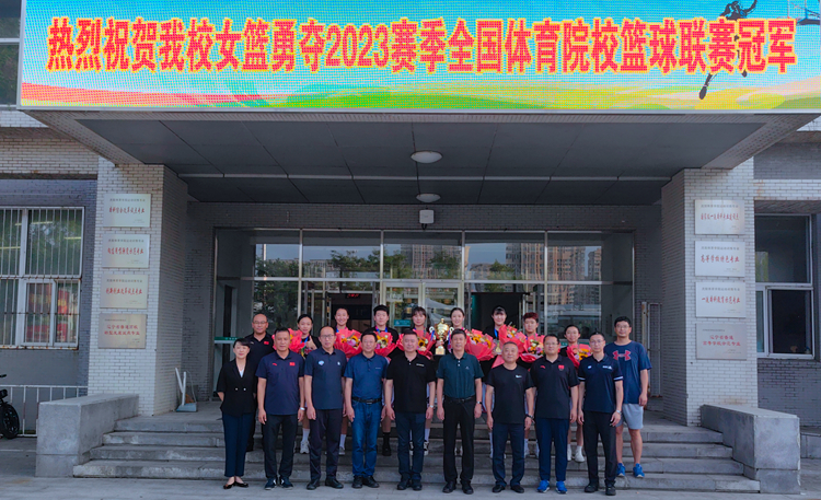 在篮排馆门前为参加“2023赛季全国体育院校篮球联赛”载誉归来的女篮健儿举行欢迎仪式。院长刘征,党委常委、副院长于文军,竞训中心主任张建波、运动训练学院领导班子、篮球教研室教师代表和20余名学生代表参加欢迎仪式。