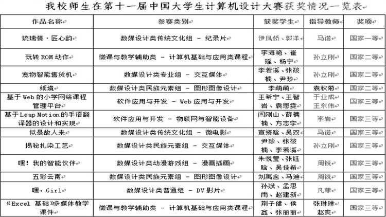 软件工程专业教学指导委员会等联合举办的第十一届中国大学生计算机设计大赛全国决赛按照11类内容在8个赛场分别举行。管理与新闻传播学院师生代表我校参赛,共有12个作品入围全国国赛,最终获得一等奖1项、二等奖3项、三等奖8项,并首次荣获优秀组织奖,创我校参赛最好成绩。