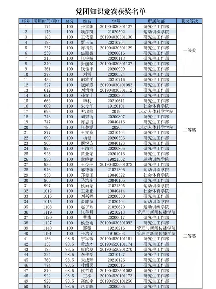 本次竞赛采取问卷星线上答题的形式,主要考察习近平总书记近期重要讲话重要指示精神;党史、新中国史、改革开放史、社会主义发展史学习辅导资料等知识的掌握。本次竞赛受到在校本科生、研究生的积极响应,共有1600余人次参与。综合答题成绩和答题用时进行排名,最终评出一等奖十名、二等奖20名、三等奖30名以及优秀奖40名。