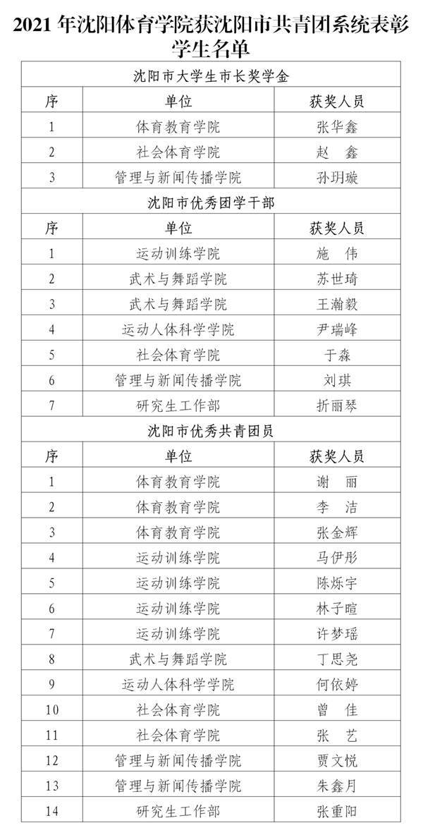 近日,2021年沈阳市大学生市长奖学金、“沈阳市十佳大学生”“沈阳市优秀共青团员”“沈阳市优秀团学干部”评选结果揭晓,我校24名学生获共青团沈阳市委、沈阳市教育局、沈阳市学生联合会表彰。 获得表彰的学生是我校广大青年学生的代表,展现了我校团员青年勤奋好学、积极向上的精神风貌。看球吧 共青团将在今后的工作中继续加强团组织建设,激励团员青年和团学干部勤奋学习、踏实工作,发挥先锋模范带头作用,以实际行动迎接党的二十大胜利召开。 新闻作者:团委 韩健 责任编辑:全魁博 新闻日期:2022-03-01 点击:次