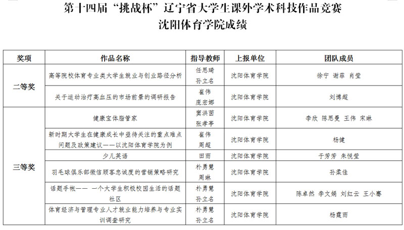 我校获奖作品证书 由共青团辽宁省委、辽宁省教育厅、辽宁省科学技术厅、辽宁省科学技术协会、辽宁省知识产权局、辽宁省社会科学院及辽宁省学联共同举办的第十四届“挑战杯”辽宁省大学生课外学术科技作品竞赛于近期落下帷幕。 本次比赛共历经3个多月,看球吧 团委在接到通知后积极准备,在我校大学生文化艺术节中开展以此竞赛为主题的比赛,通过层层选拔,共选出11个作品参加辽宁省比赛。最终我校共获得2个二等奖、6个三等奖的好成绩。庞红娜荣获省“优秀指导教师”称号。 新闻作者:团委 韩健 责任编辑:朱翠立 新闻日期:2019-09-16 点击:次